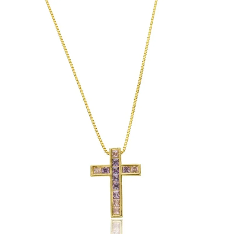 COLAR CRUZ COM ZIRCONIA LILAS E ROSA BANHADO A OURO 18K
