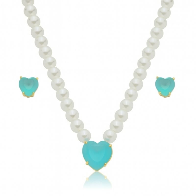 CONJUNTO CORAÇÃO AZUL COM PÉROLA BANHADO A OURO 18K
