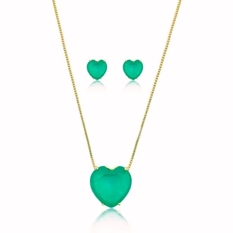CONJUNTO CORAÇÃO VERDE PEDRA FOSCA BANHADO A OURO 18K