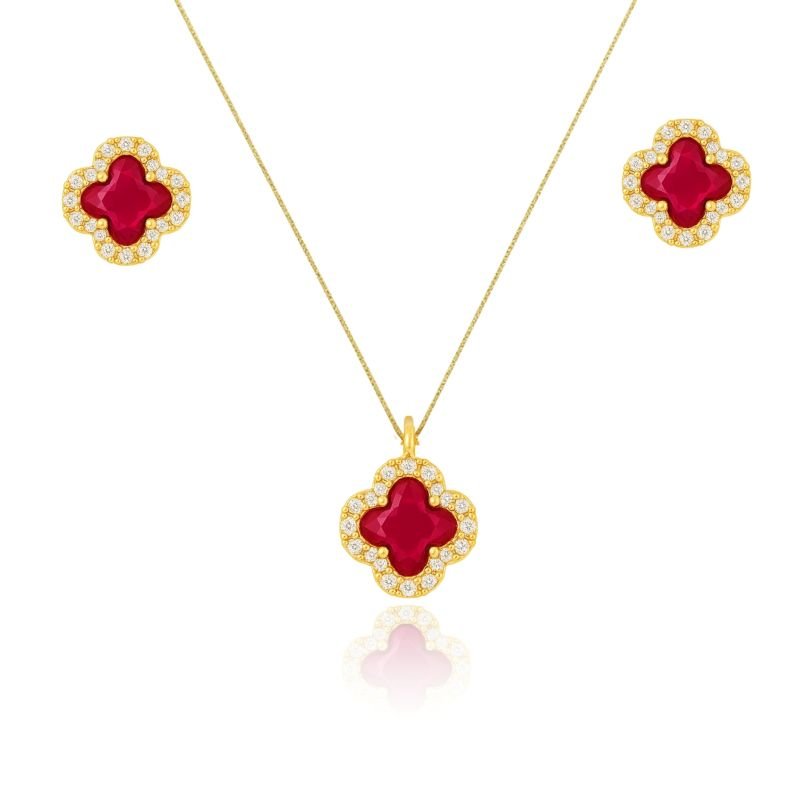 CONJUNTO TREVO VERMELHO CRAVEJADO BANHADO A OURO 18K