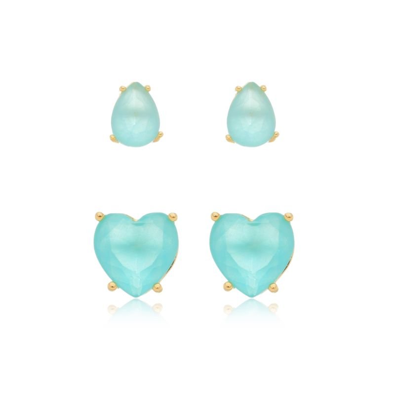 KIT 2 PARES DE BRINCOS GOTA E CORAÇÃO AZUL FOSCO DOURAFO FOLHEADO