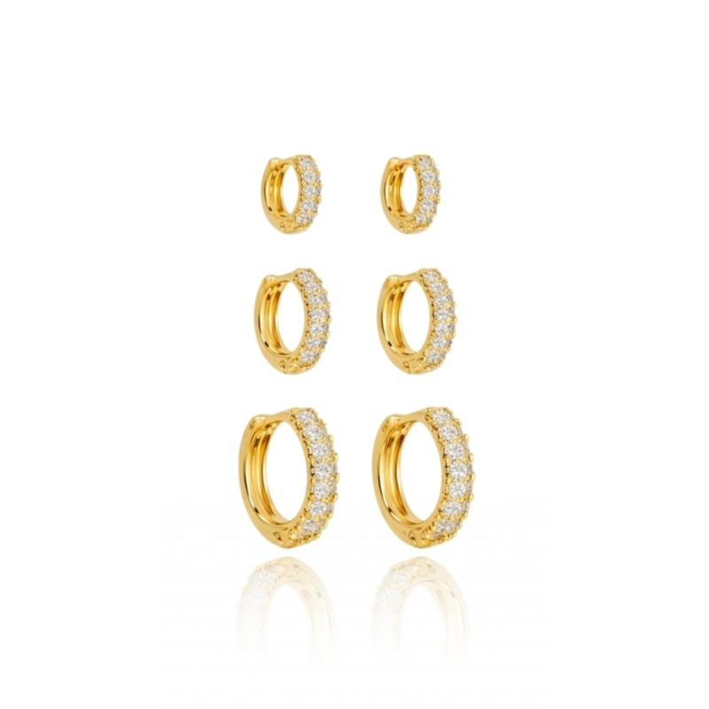 KIT TRIO DE ARGOLAS DUAS FILEIRAS DE ZIRCÔNIA BANHADO A OURO 18K